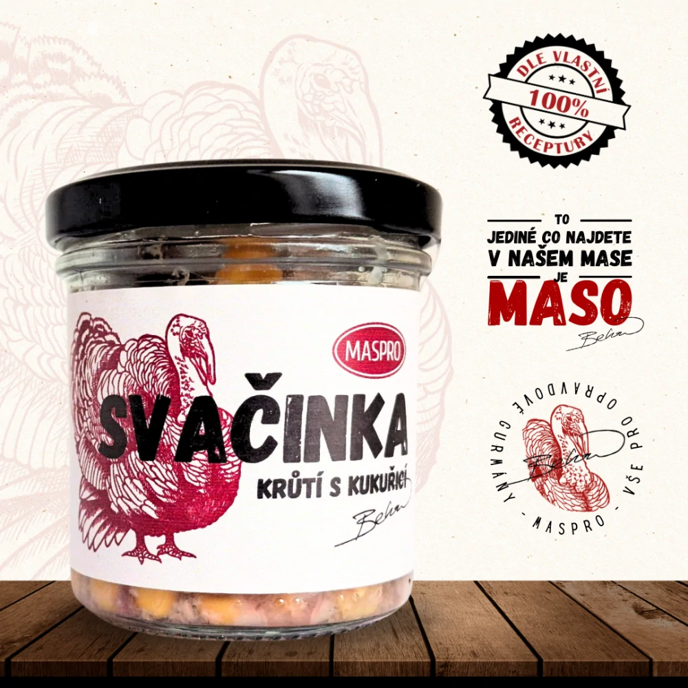 Výroba svačinky krůtí s kukuřicí začíná pečlivým výběrem kvalitního krůtího masa a kukuřice od lokálních dodavatelů. Maso je zavařeno ve vlastní šťávě společně s kukuřicí, což zajišťuje, že si zachovává svou šťavnatost a všechny výživné hodnoty. Celý proces je prováděn s maximální péčí a důrazem na hygienu a kvalitu.